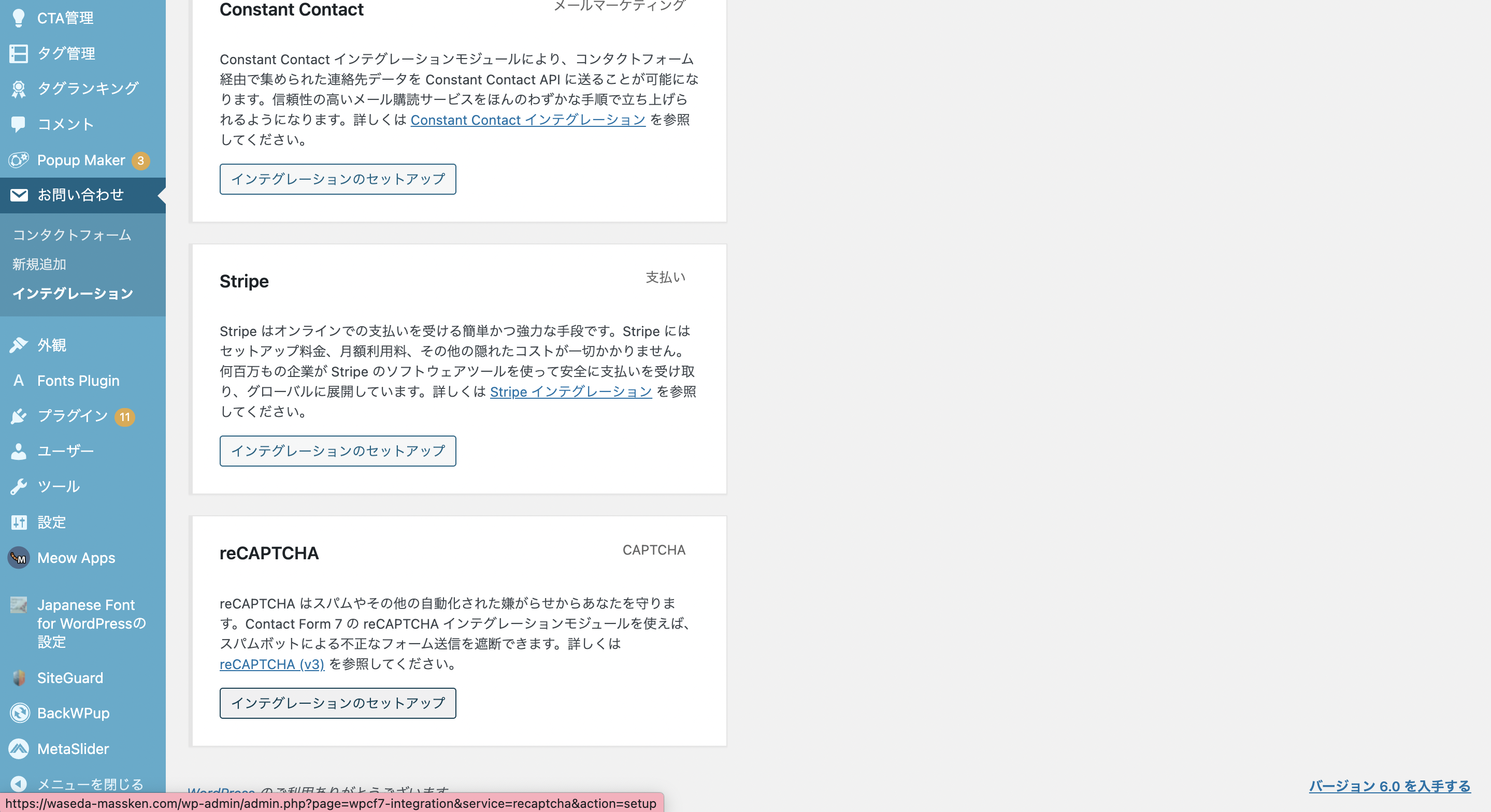 Word pressにログインし、メニューバーより「お問い合わせ」>「インテグレーション」の順で開きます。