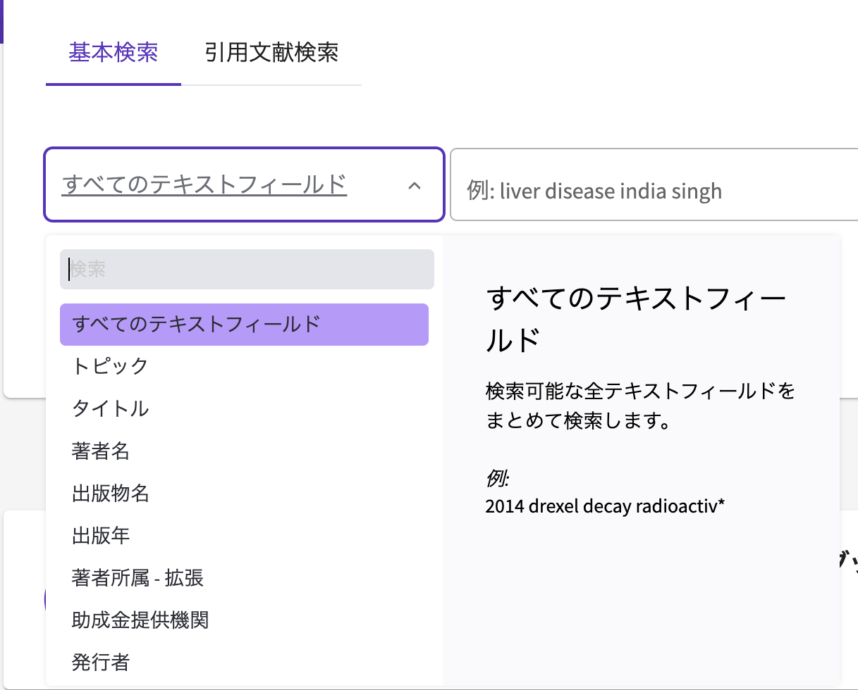 検索欄にキーワードを入力し、検索フィールドを選択して検索ボタンを押すことで基本検索ができます。検索フィールドは、トピック、タイトル、著者名、出版物名など様々な指定が可能です。