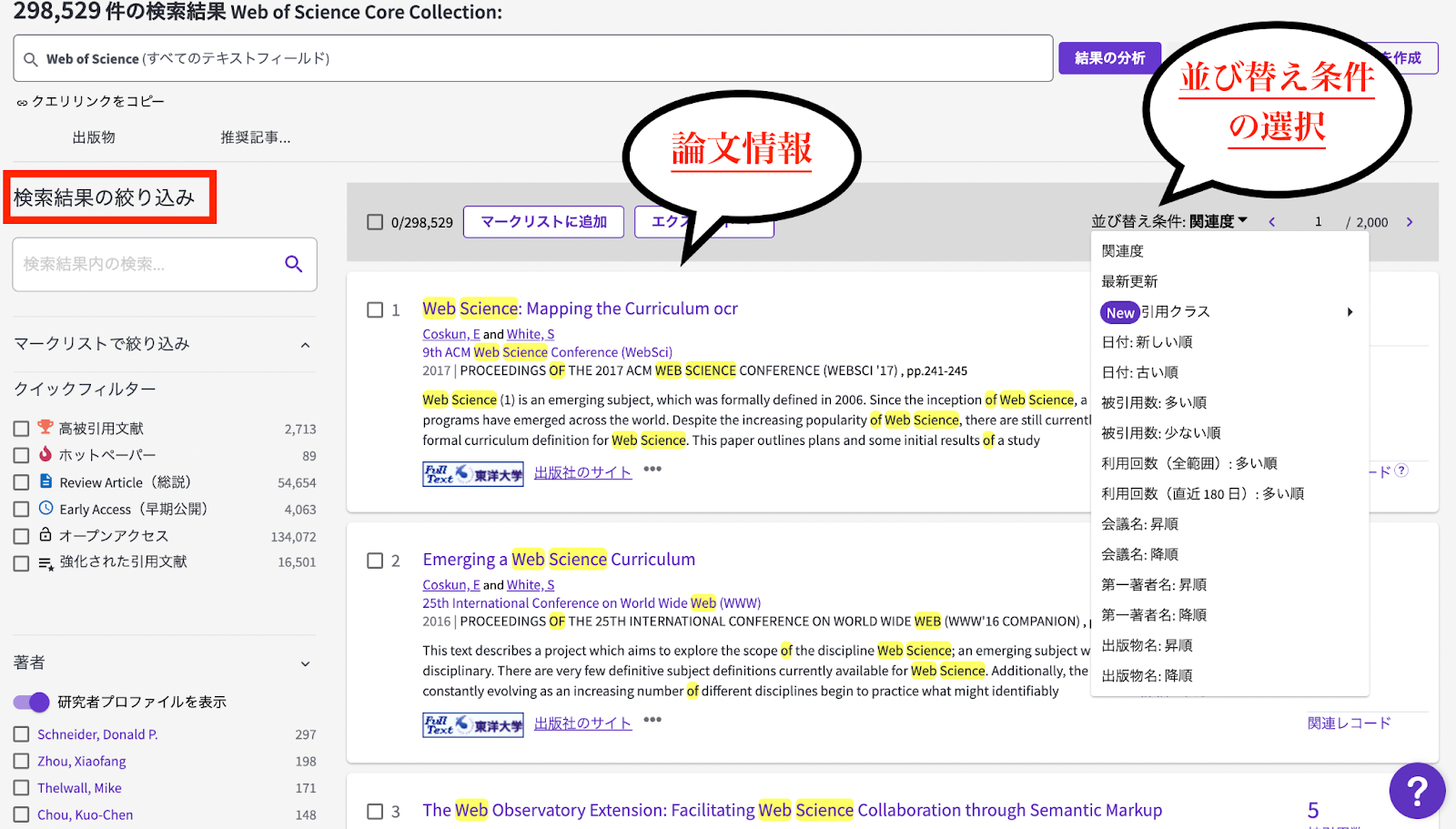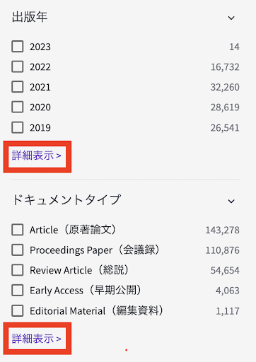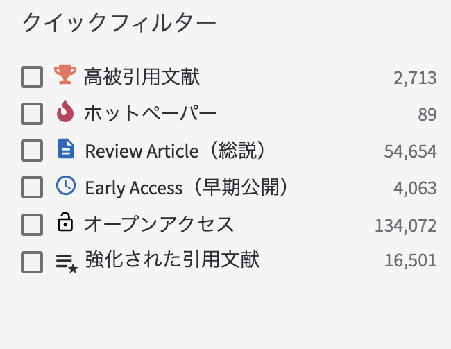 また、左端にあるチェックボックスを利用することで、検索結果の絞り込みを行えます。高被引用文献や早期公開論文などで絞り込むことが可能です。