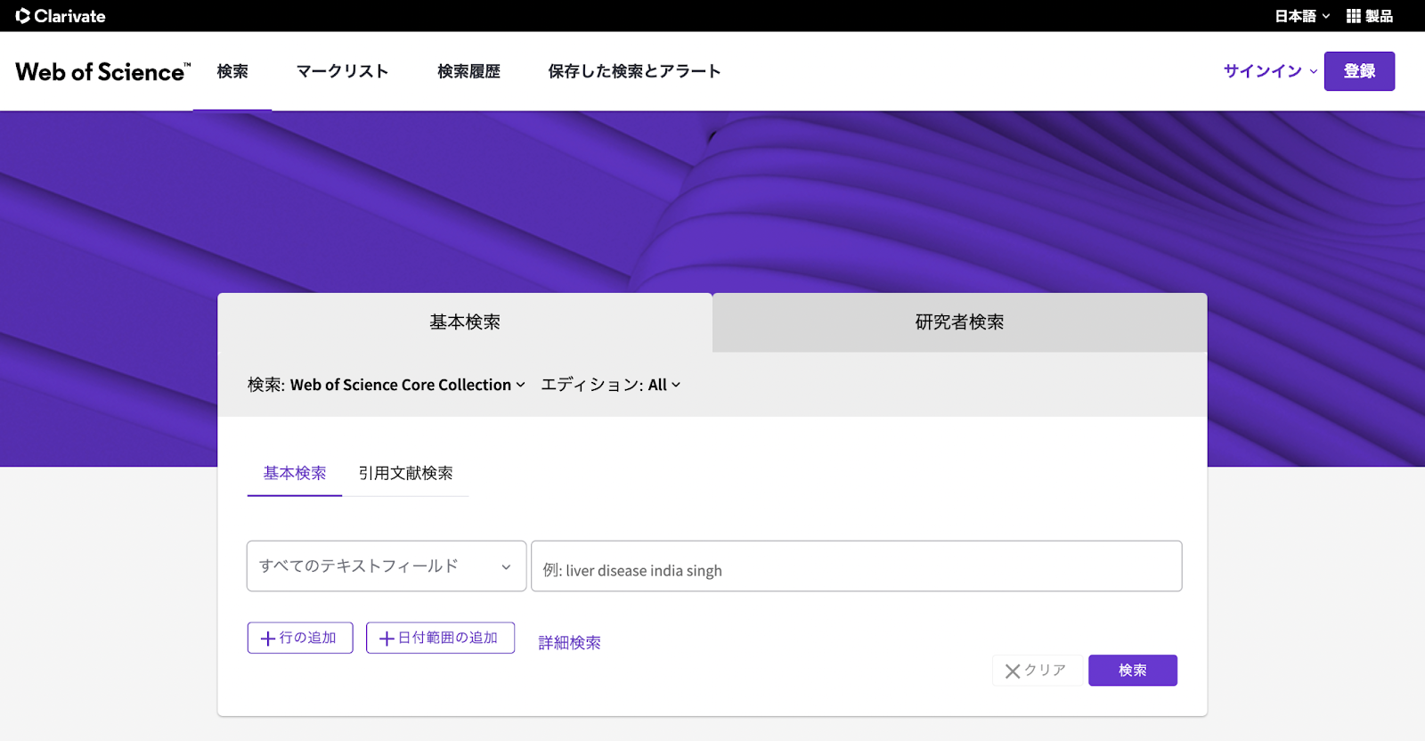 Web of Scienceにアクセスした際の初期画面は、以下のような基本検索になっております。