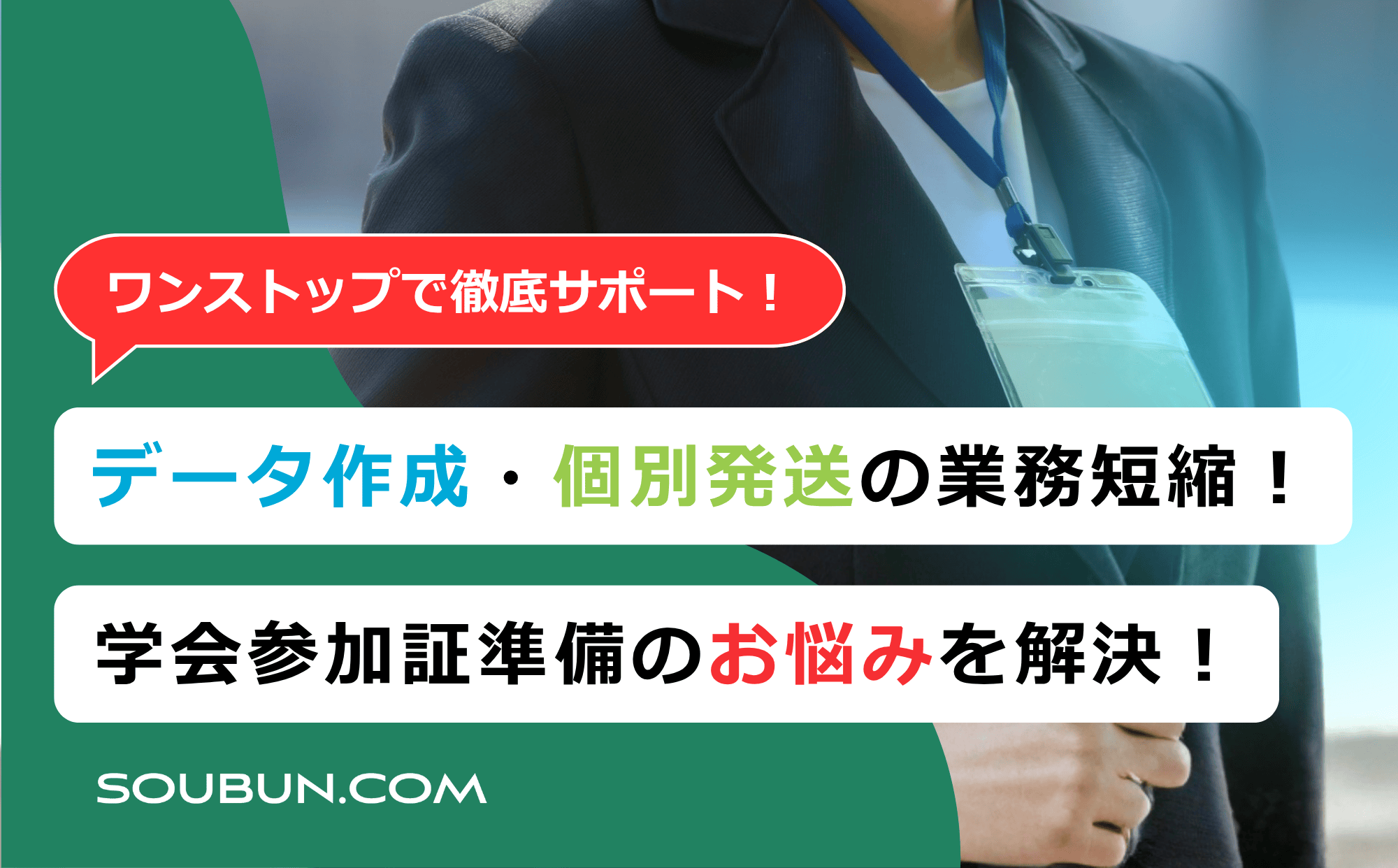 学会やセミナーで必須となる参加証や登録証の印刷、データ作成、さらには参加者への個別発送まで、SOUBUN.COMがワンストップでサポートいたします。
